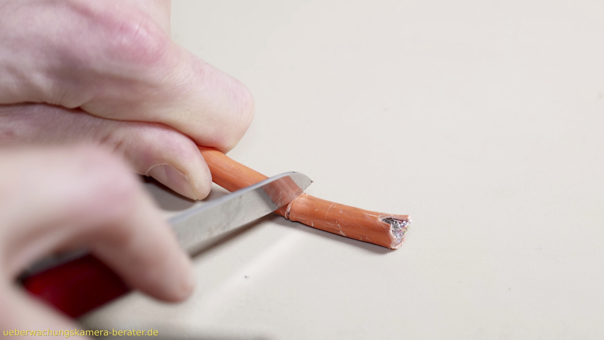 - Entferne ca. 3 cm der Kabelummantelung. Nutze ein scharfes Messer oder – noch besser – einen Abisolierer.