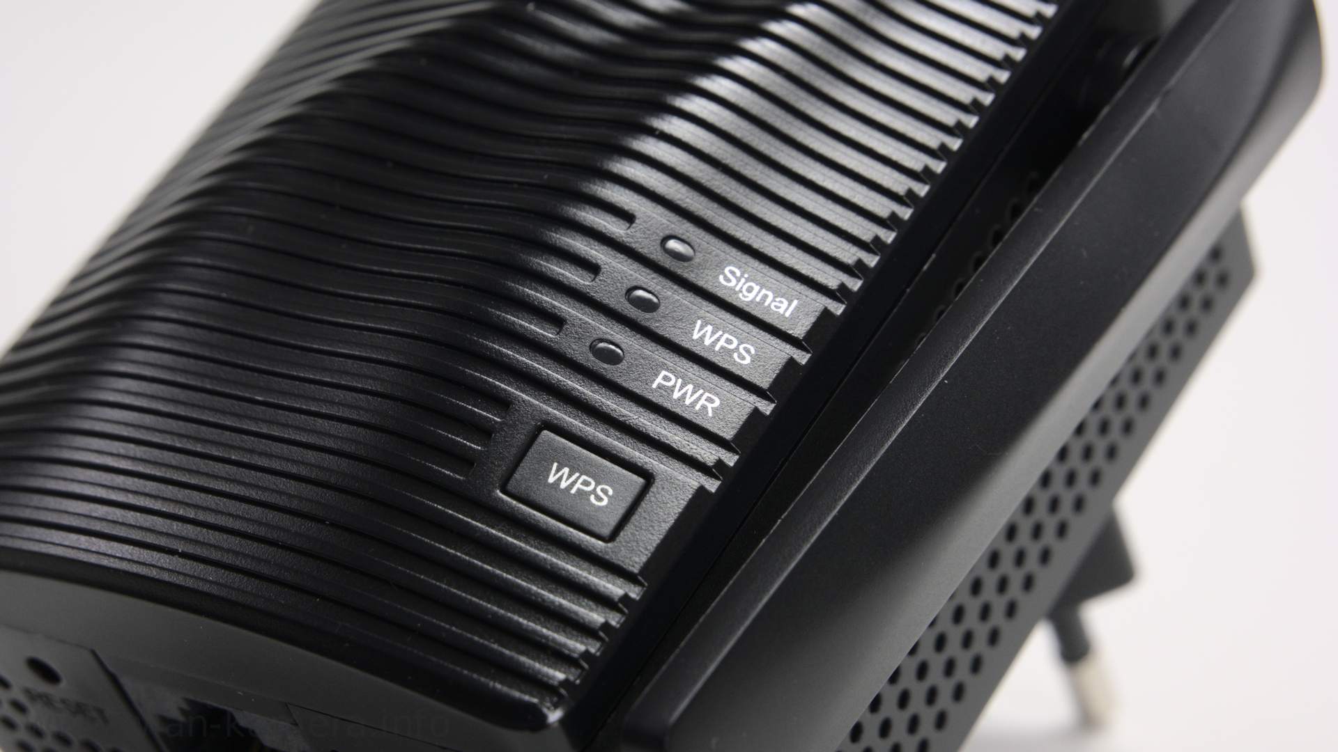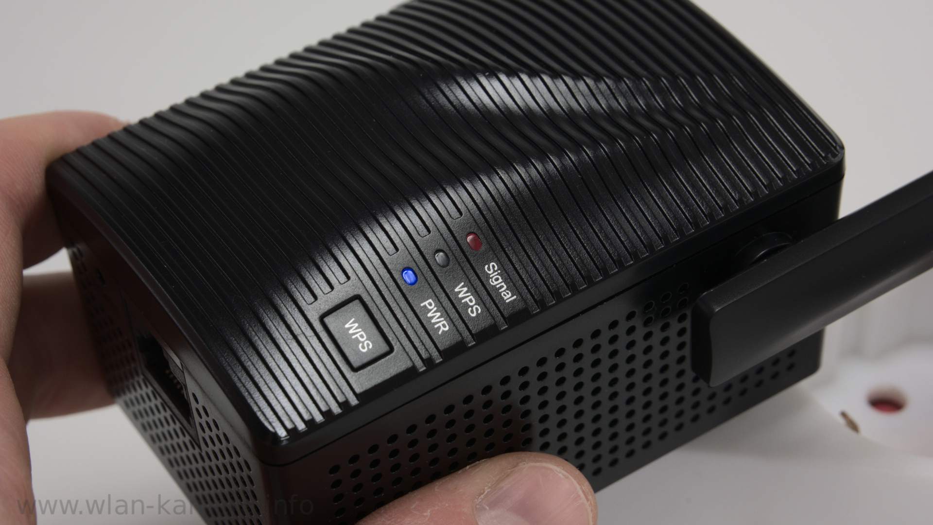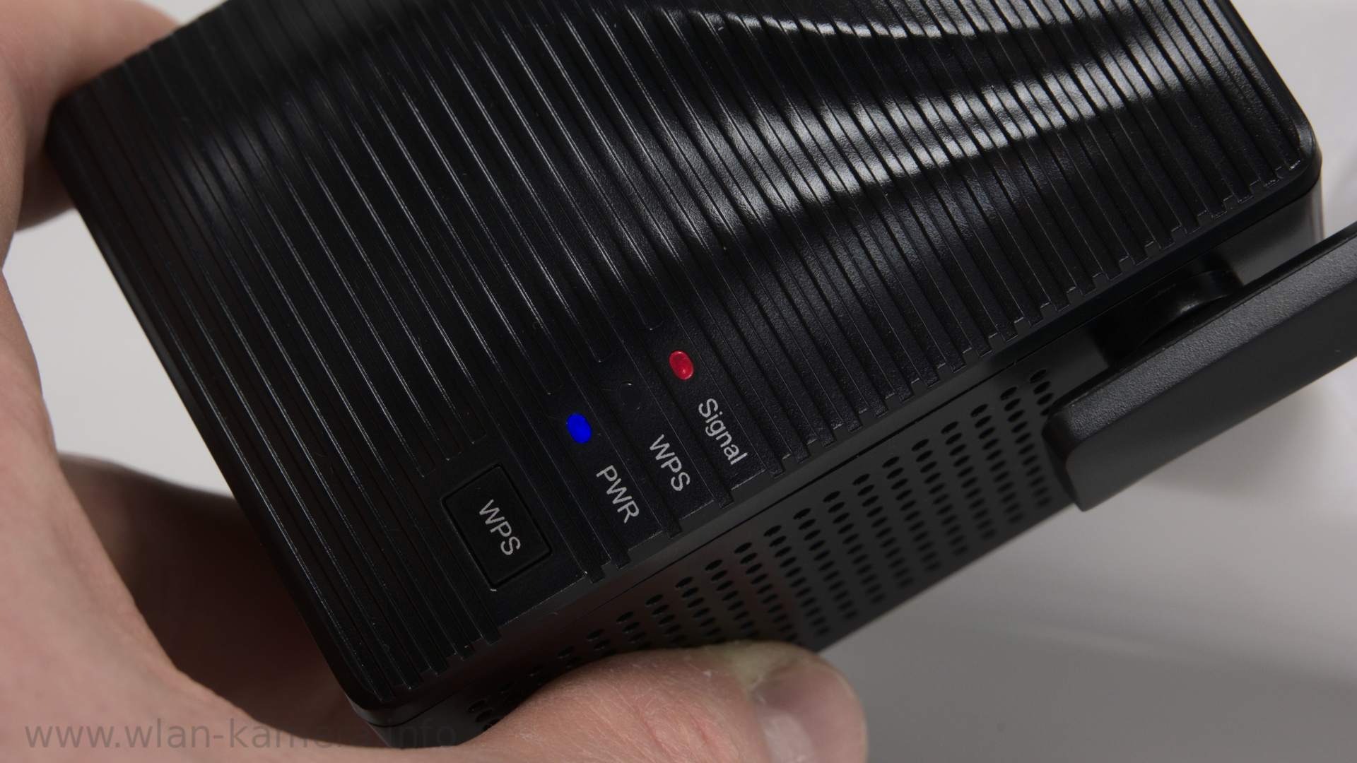 - Signal LED unten: Leuchtet dauerhaft blau, Verbindung ok und Signal stark genug. Rot: Signal schlecht zu weit vom Router weg.