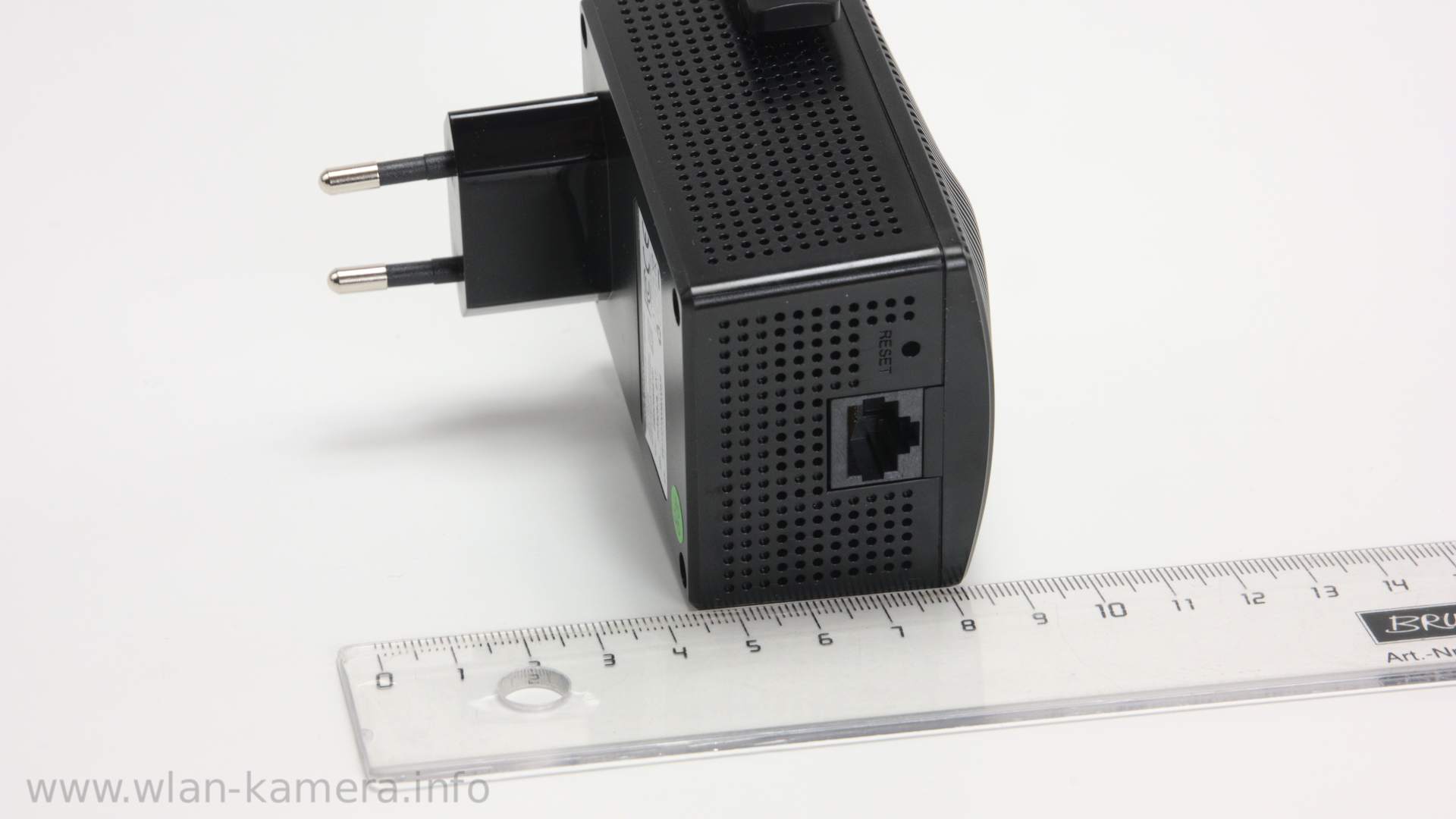 Der Repeater ist sehr kompakt und kann direkt in die Steckdose gesteckt werden. Keine Kabel oder Netzteile die irgendwie stören würden. Auf der Unterseite befindet sich noch ein Restknopf und ein Gigabit LAN-Anschluss.