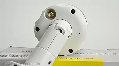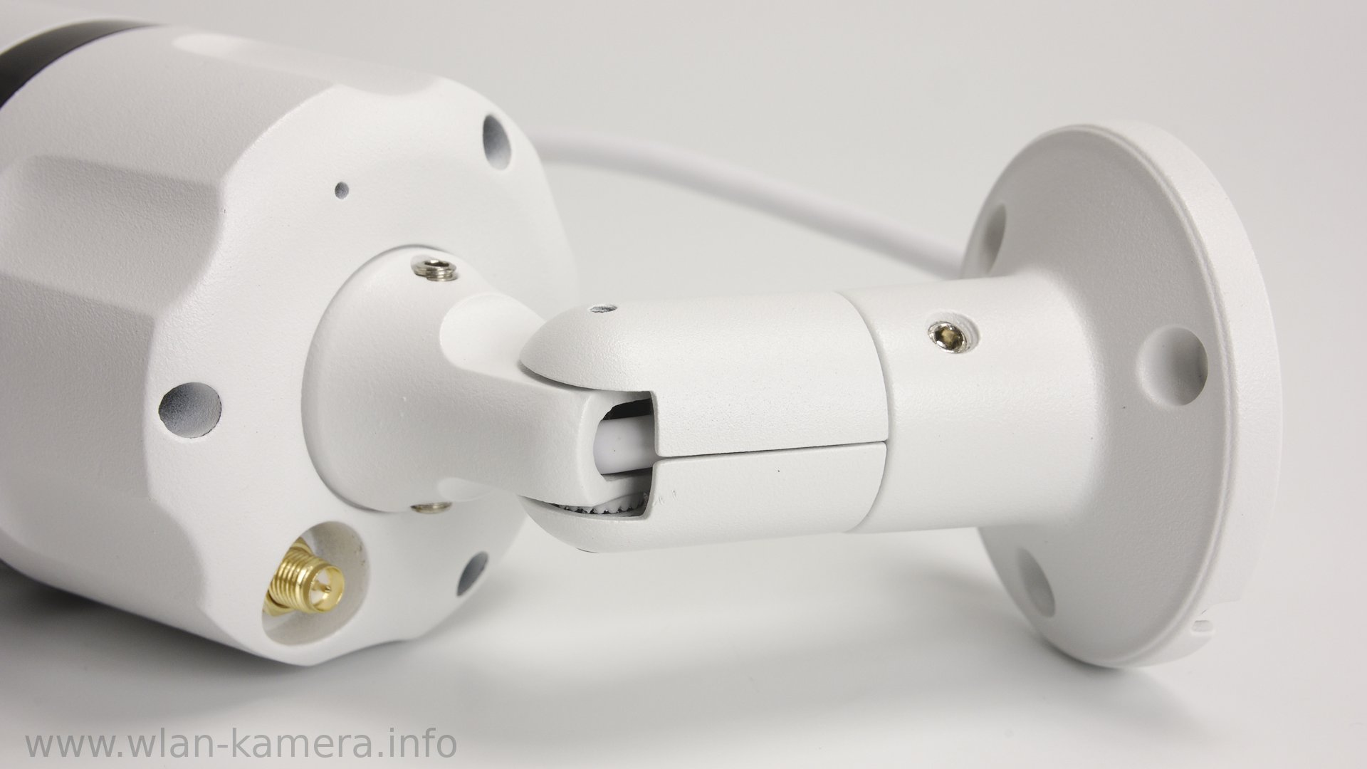 Die Kamera kann auf drei Achsen verstellt werden. Dazu müssen zuerst die Schrauben gelöst werden. Dabei gibt es zwei Schrauben oben direkt nahe der Rückseite. Eine weitere Schraube befindet sich am offensichtlichen Gelenk in der Mitte und zu guter Letzt gibt es noch eine Schraube am Fuß bzw. am Sockel für die Befestigung an der Wand. Über diese drei Achsen können wir die Kamera dann ausrichten und in nahezu jede Position bringen.