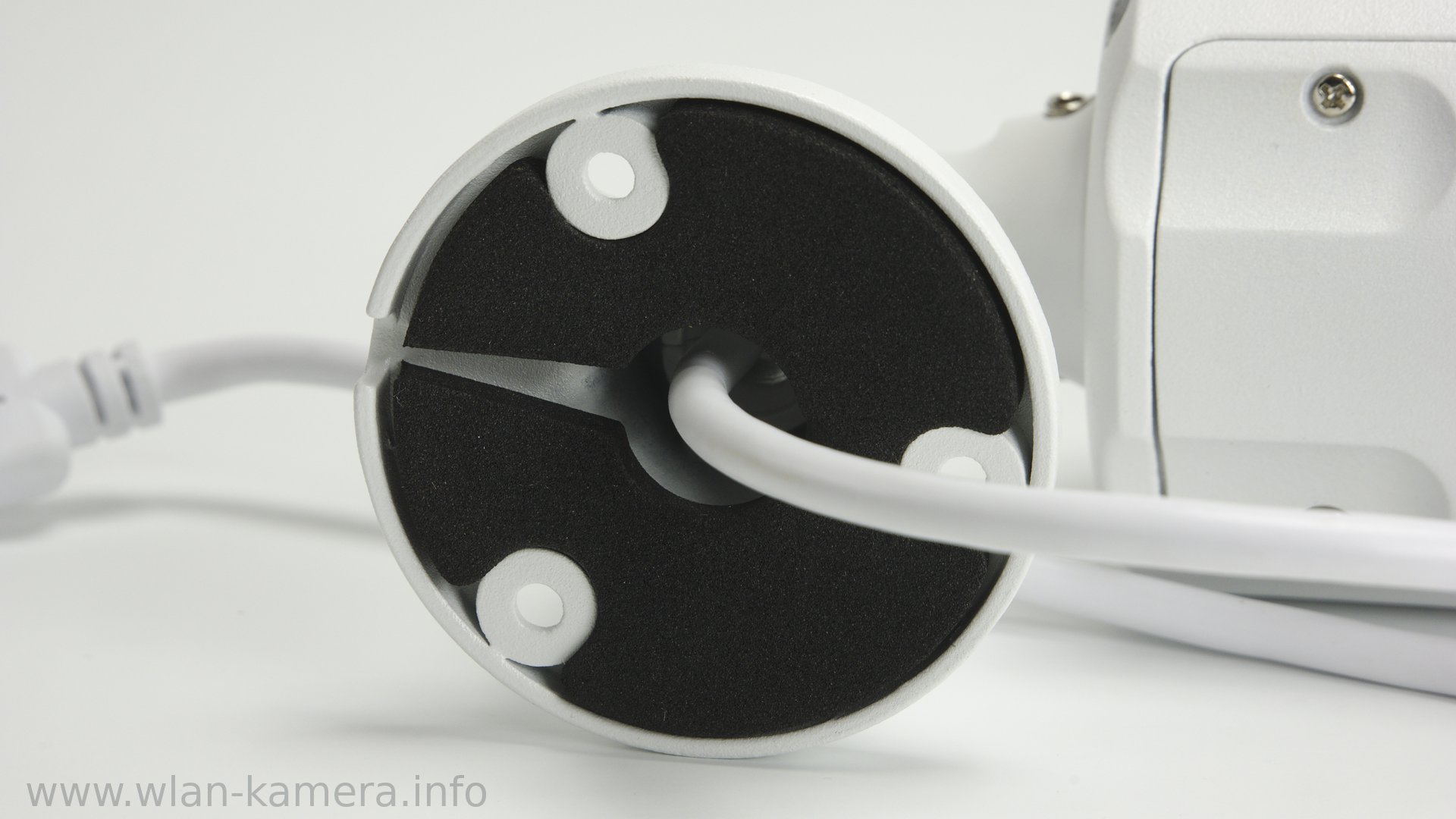 Auf der Rückseite der Kamera haben wir neben dem Antennenanschluss(WLAN) auch noch ein kleines Loch in dem sich ein Mikrofon befindet. Eine Testaufnahme damit gibt es im separaten Video mit den Testaufnahmen. Vorne hat die Kamera ein kleines Dach als Schutz vor Regen oder Schnee. Das Kabel des Netzteils ist etwas kurz, denn es ist nur 60 cm lang. Notfalls kann es aber mit einem DC-Verlängerungskabel verlängert werden. Im Kabel der Kamera befindet sich außerdem noch ein Resetknopf unter einer Schutzkappe. Mit diesem kann die Kamera zurückgesetzt werden.