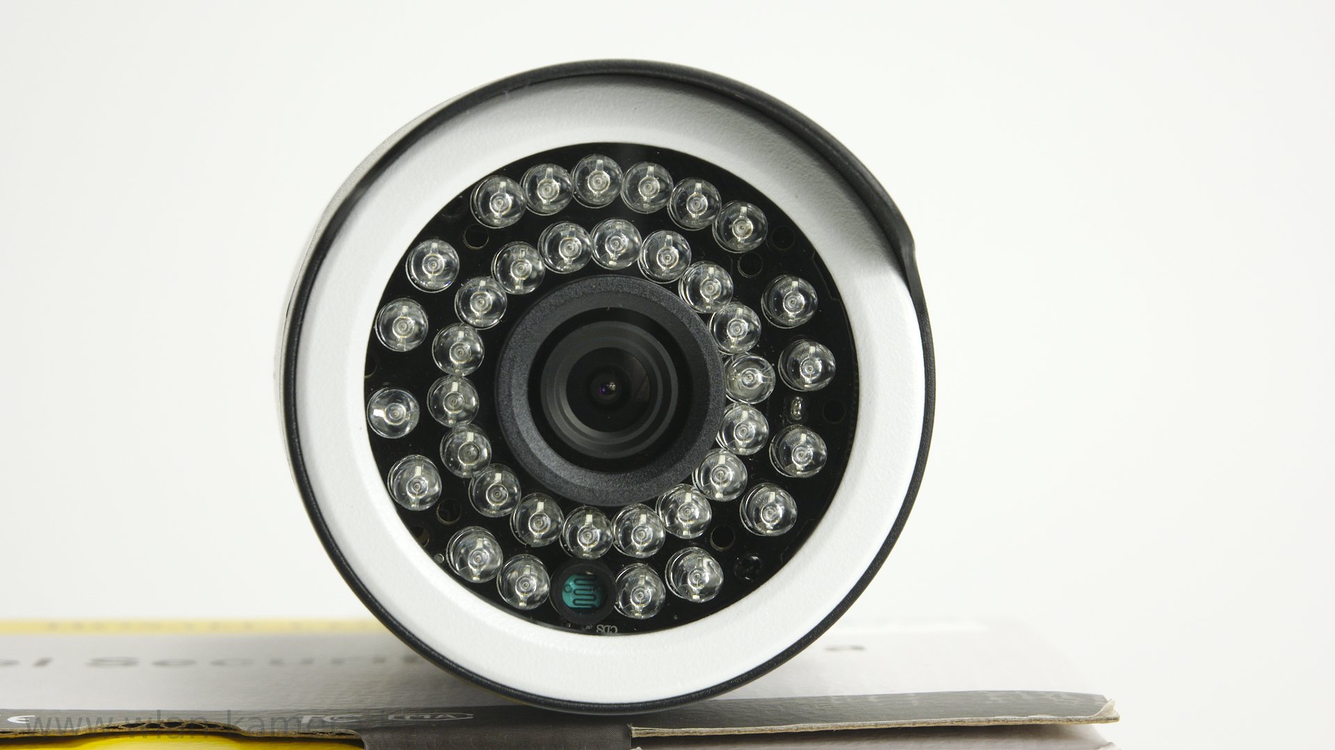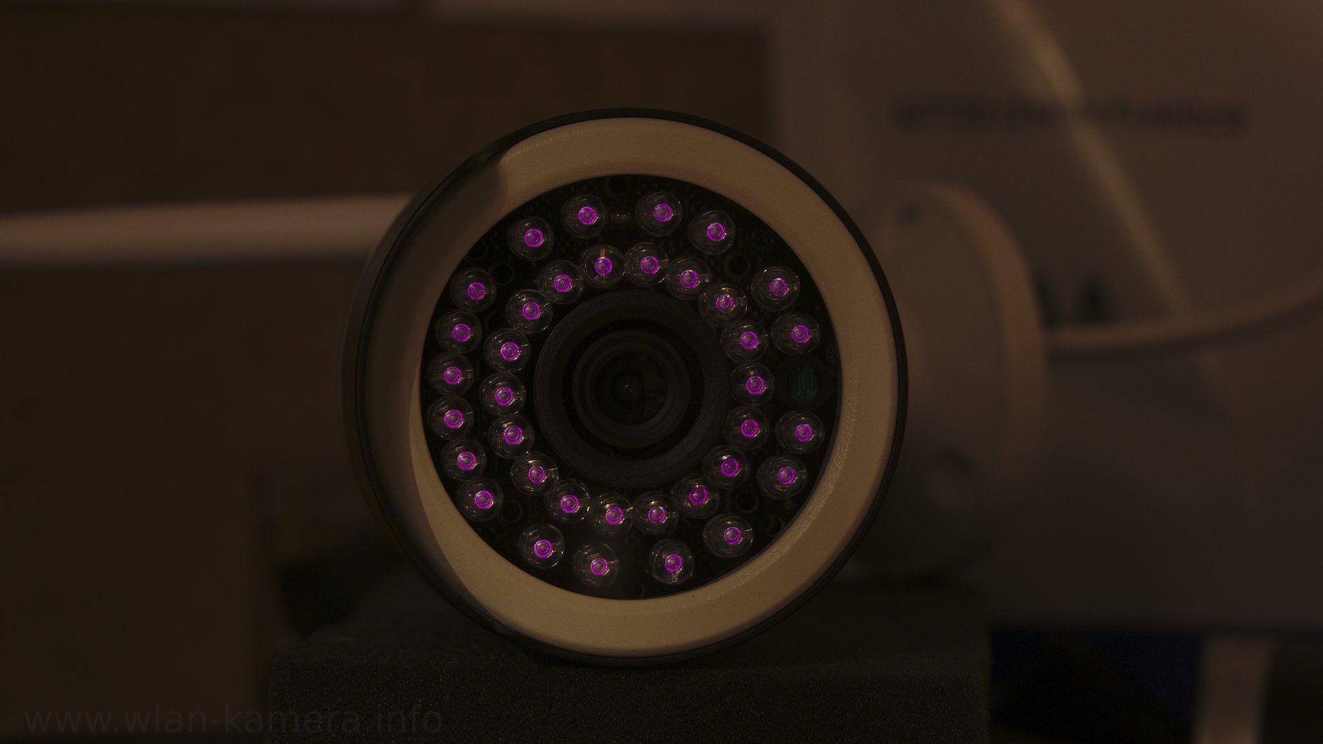 Die Kamera wirkt gut verarbeitet und das Gehäuse ist aus Metall. Vorne sehen wir das 3,6 mm Objektiv und drumherum 36 Infrarot LEDs. Diese Infrarot LEDs ermöglichen die Nachtsicht und im Dunkeln leuchten diese rot. Unten sehen wir dann noch einen Lichtsensor. Dieser misst das Umgebungslicht und schaltet bei Bedarf die Infrarotleds automatisch ein. Einen PIR-Sensor für die Bewegungserkennung gibt es hier nicht.