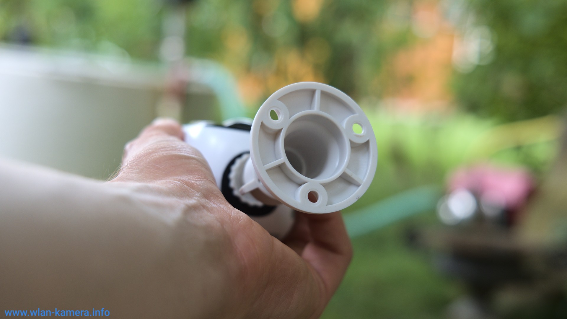 Auf der Vorderseite ganz oben befinden sich das Objektiv(130°), darunter die beiden IR-LEDS und LEDs fürs Licht. Links daneben ist eine Status-LED und die leuchtet blau, wenn die Aufnahme aktiv ist. Deaktivieren lässt sie sich allerdings nicht. Rechts daneben befindet sich ein Mikrofon. Die runde Halbkugel ganz unten ist der sogenannte passive Infrarotsensor, kurz PIR.