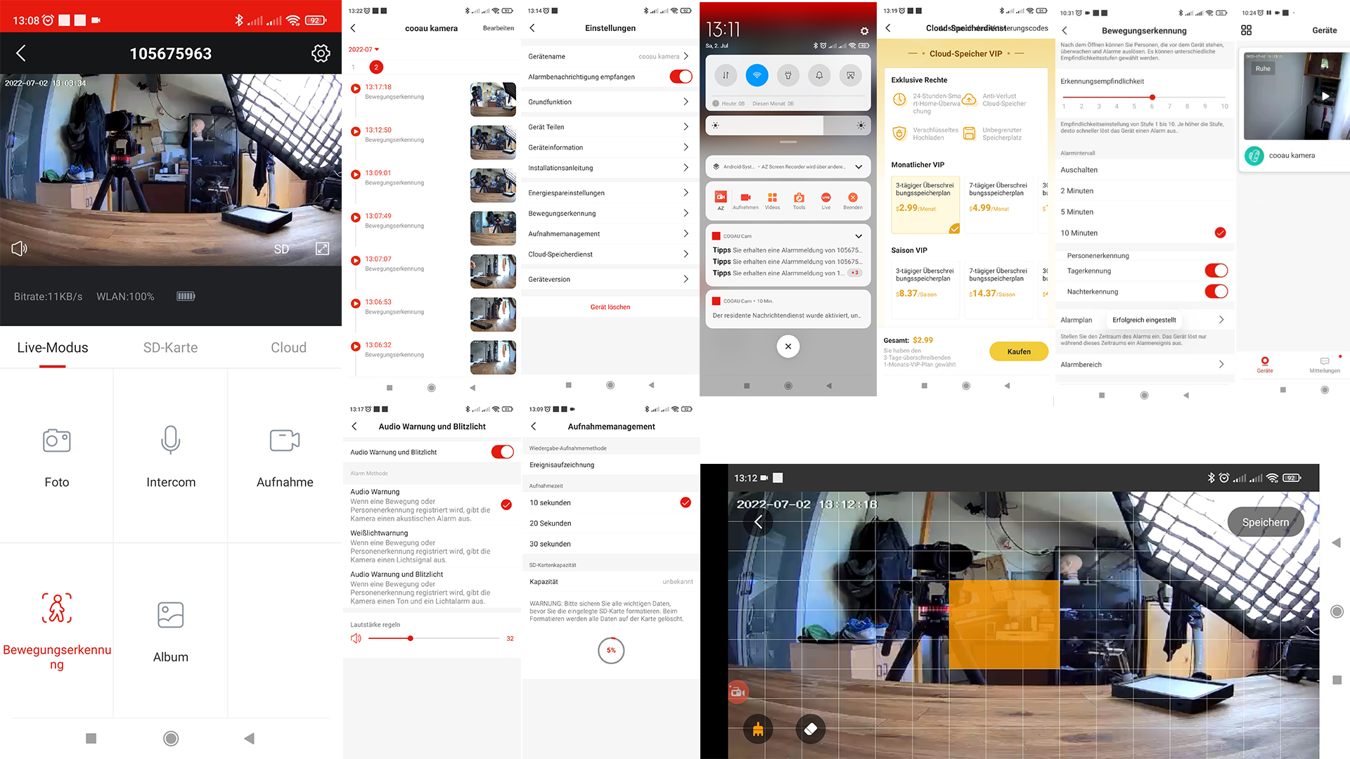 Die Push-Nachrichten kommen fast zeitgleich (nach ca. 5 Sekunden) mit dem Alarm an und ein Pop-up in der App lässt sich auch einstellen. Das integrierte LED-Licht besitzt bei Nacht einen gewissen Abschreckungseffekt und eine Sirene ist auch möglich. Das Licht geht allerdings bei Nacht immer an, egal ob ich es ein oder ausschalte. Es wird auf eine Speicherkarte aufgezeichnet und eine Cloud ist möglich.