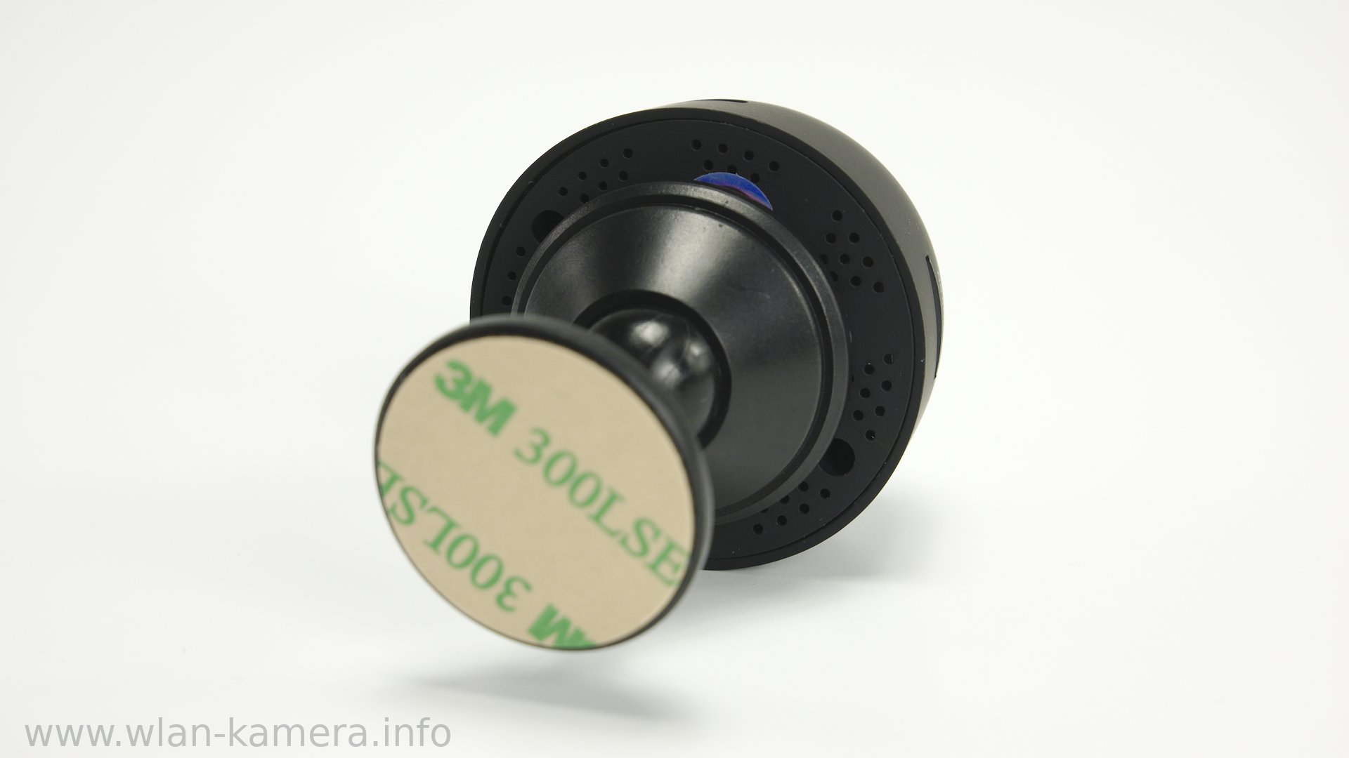 Die beiliegende Halterung kann an die Wand geklebt werden, dafür ist bereits ein Klebepad angebracht. Die Kamera selbst ist magnetisch und hält so an der Halterung. Die Halterung selbst ist sehr flexibel und verfügt über eine Kugel, welche eine sehr flexible Positionierung ermöglicht. Drehen und Neigen in alle Richtungen ist möglich. An einer Stelle gibt es noch eine Kerbe, damit die Halterung bis zu 90° gekippt werden kann.