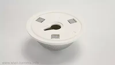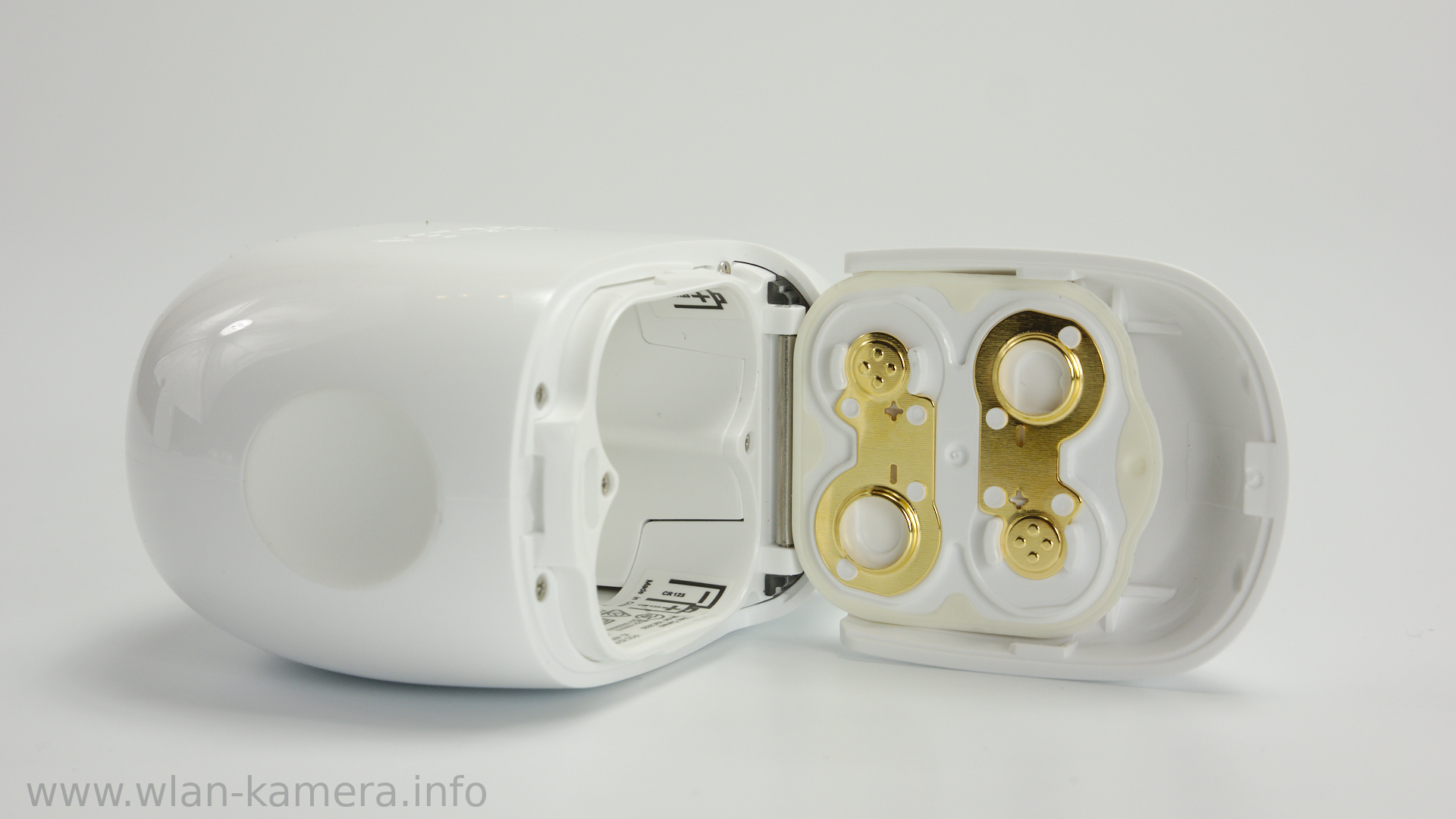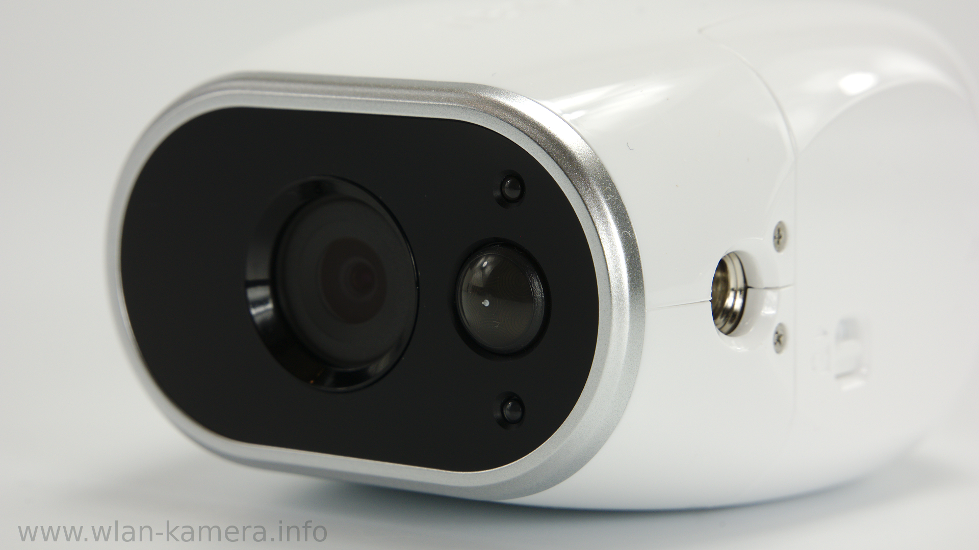Auf der Vorderseite der Kamera befindet sich in der Mitte das Objektiv. Es handelt sich um ein Weitwinkelobjektiv mit einem Blickwinkel von 110°. Um das Objektiv herum befinden sich die IR-LEDs welche bei Nacht rot leuchten. Unter dem Objektiv befindet sich ein passiver Infrarotsensor (kurz PIR), welcher für die Bewegunsgerkennung zuständig ist. Rechts außen befindet sich eine Status-LED, welche wir bei der Installation, im Video, bereits in Aktion gesehen haben. Links außen sehen wir dann noch etwas, das auch aussieht wie eine LED. Ich vermute allerdings, dass es sich dabei um den Lichtsensor handelt. Das ist nur eine Vermutung, denn ich konnte keine genaue Dokumentation darüber finden.