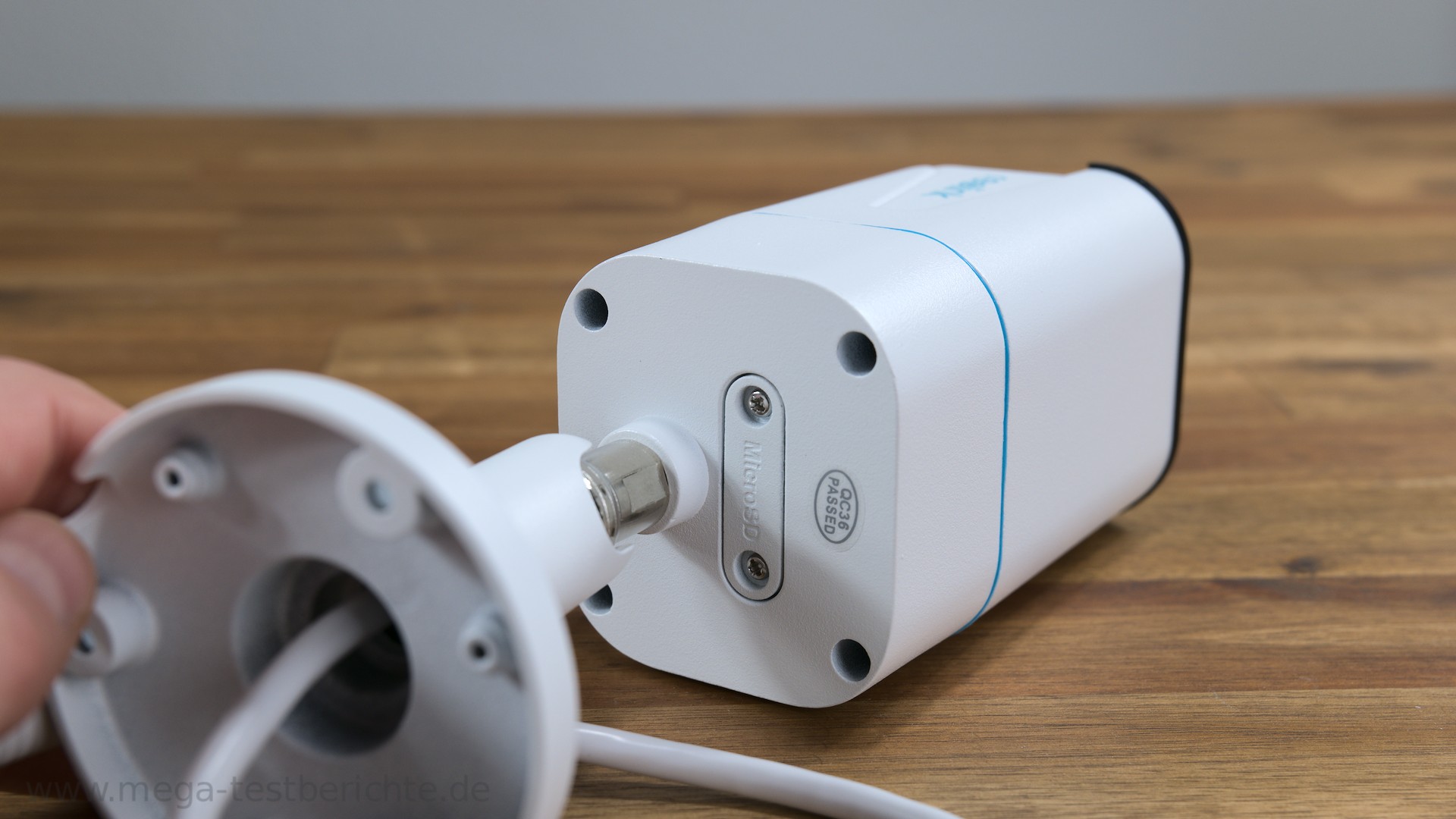 Das Gehäuse besteht aus Metall und vorne gibt es ein kleines Vordach, welches das Objektiv z.B. vor Schnee schützt. Alles ist IP66 geschützt und somit wetterfest. Die Verarbeitung wirkt sehr stabil und solide.